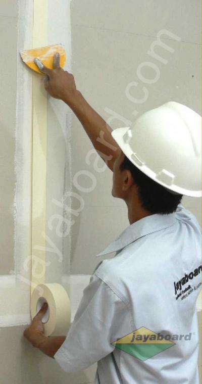 * Penguat jointing compound pada pertemuan papan gipsum plafon datar dan partisi gipsum.